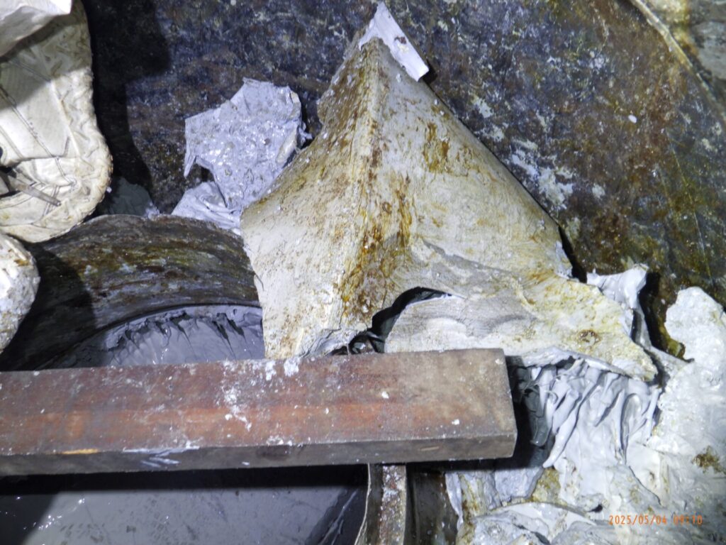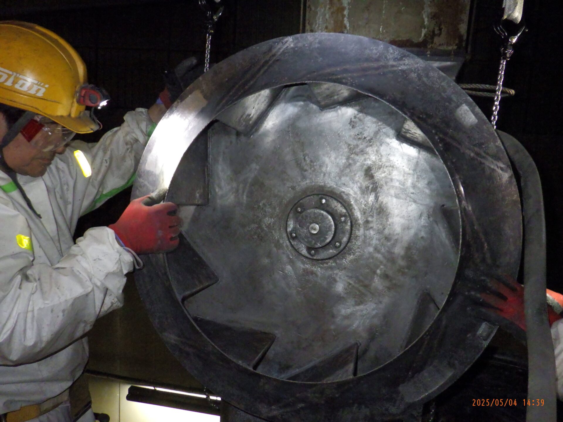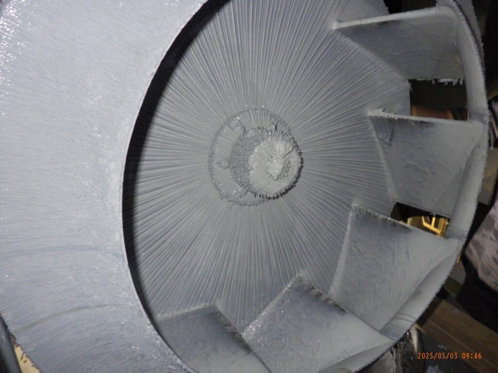 天板が開かない原因は、ケーシング内の堆積した塗料がインペラ側天板迄広がり数センチの厚みになって 硬化してしまっている状態でした。